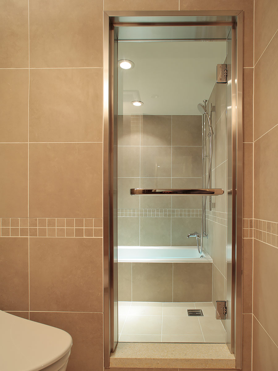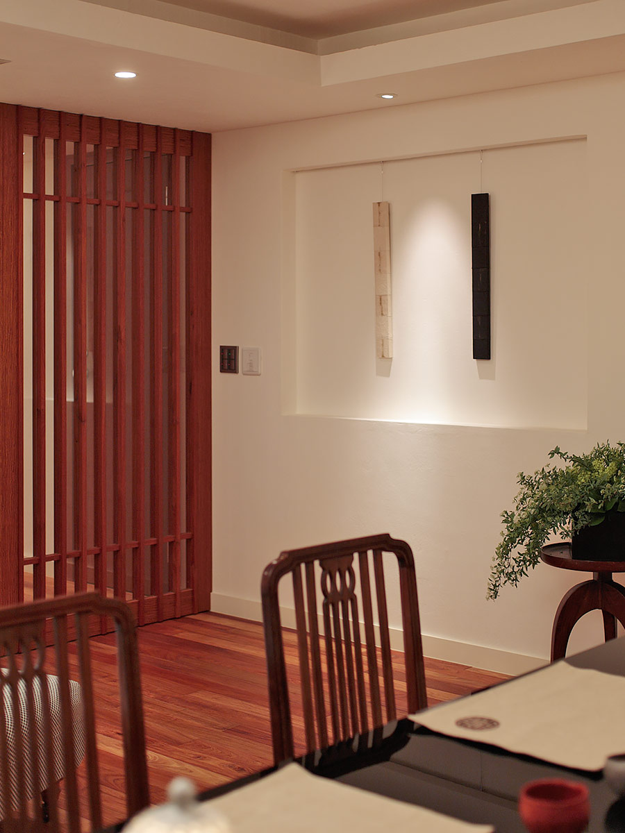 都心の利便性と、多忙なご夫婦の寛ぎを兼ね備えた、ヴィンテージマンションの上質リフォーム。玄関には大谷石の壁と少し低めのニッチが訪れる人をもてなし、好みのディスプレイや掛け軸などが楽しめるスペースにもなっています。赤みのあるカリンの無垢フローリングや、壁・天井に施された漆喰などの自然素材が、都心とは思えない艶やかさと落ち着きのある空間を創り出し、リビングに設置した格子の引き戸が、和の雰囲気を醸し出しています。